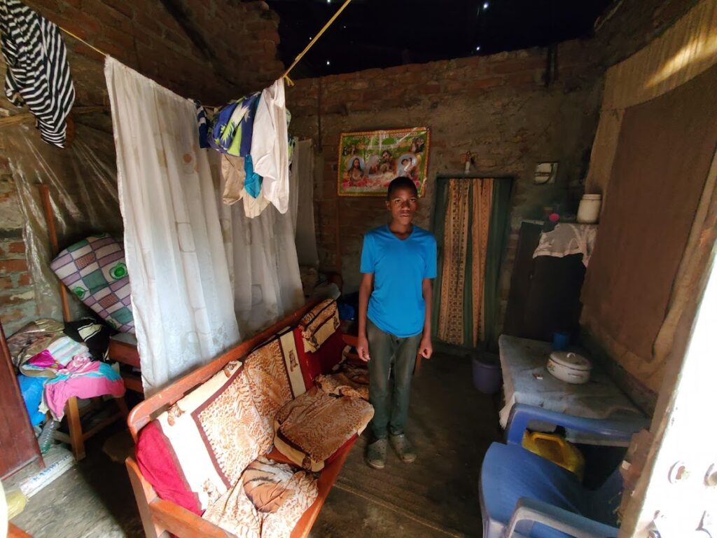 Patrick comes from an unfortunate background where his mother is away all the time to earn money to support the family. He is left in the care of extended family who require that he do most of the housework. He lives with his family in a small one-room home that contains a shared bedroom, living room and dining room (see photo below). His hope is to complete school and start a trade as either a mechanic or in a shop so that he can become independent and not have to rely on his extended family.