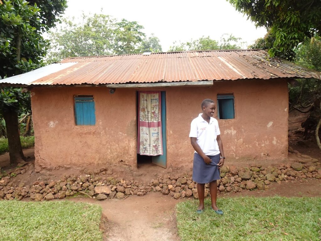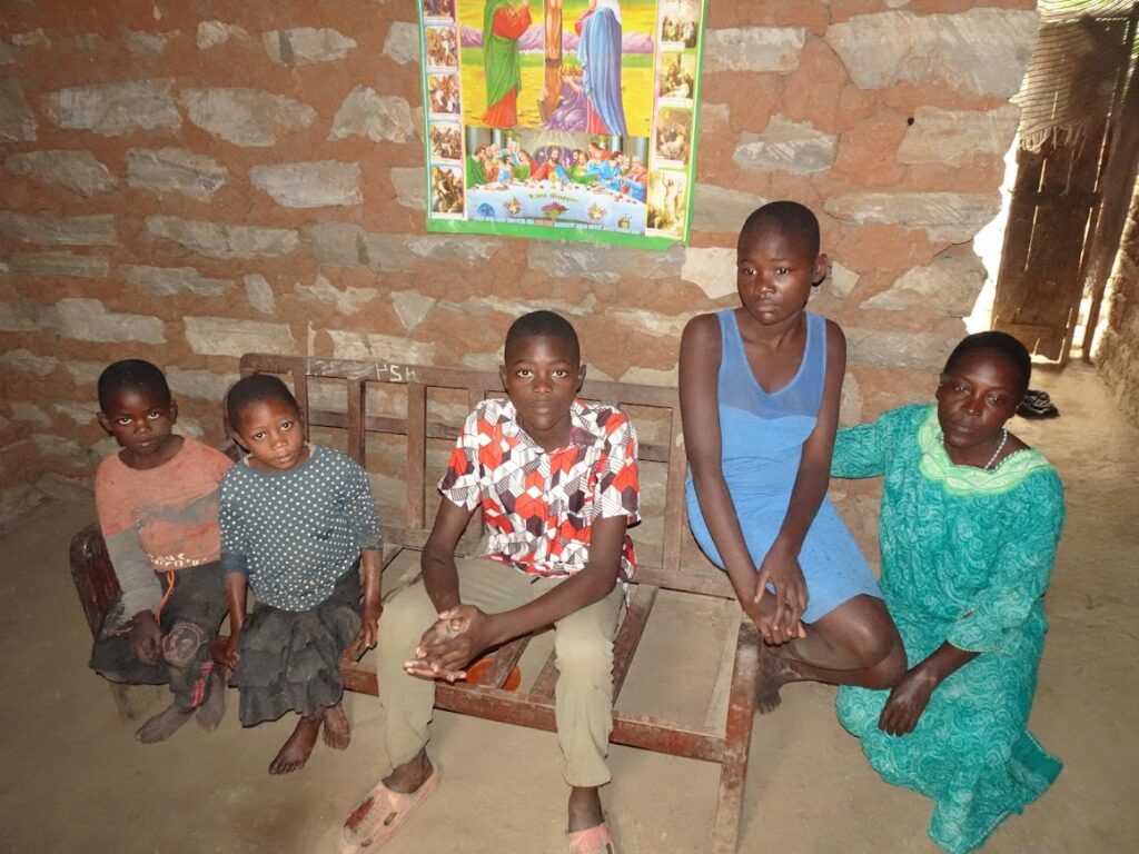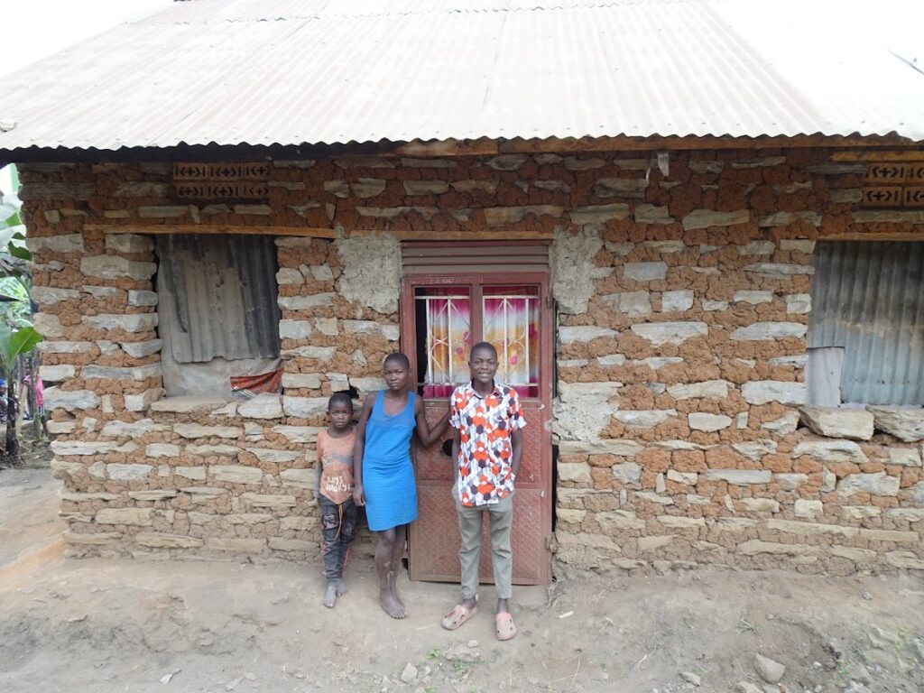 Geoffrey lives at home with his mother and 4 siblings. His mother supports the entire family through menial labour jobs. His ambition is to become a doctor one day. He is a smart, bright and confident student who we hope will succeed in his education. Below is a photo of Geoffrey in his home with his family (mother to the right and then three of his siblings). This photo was taken in their living room where their only furniture is a wooden seat.