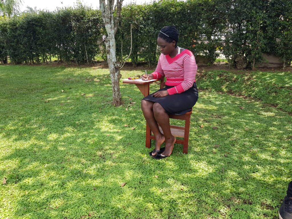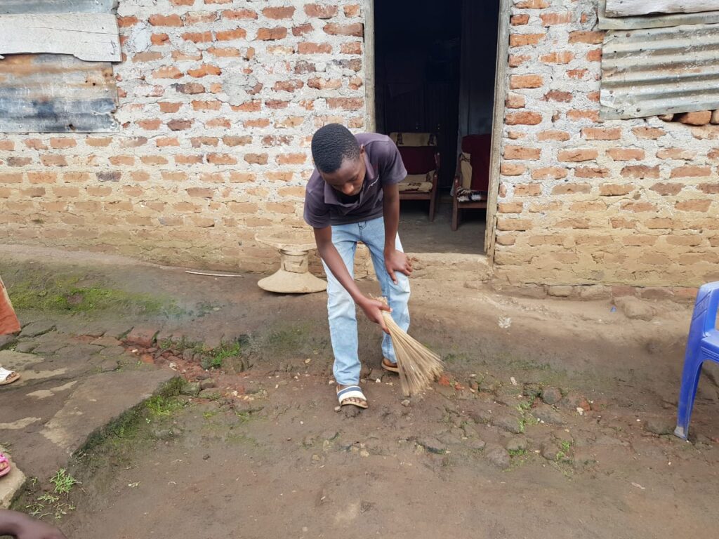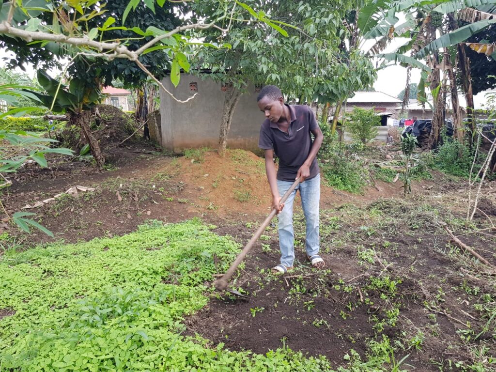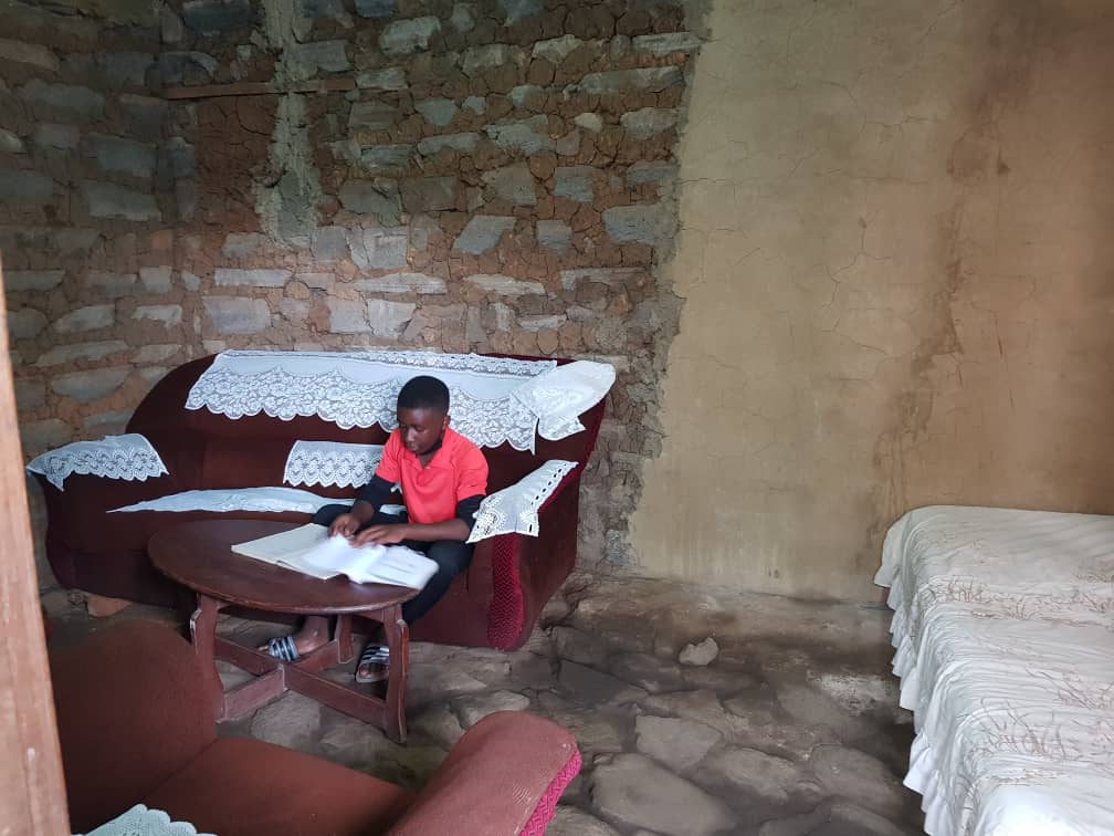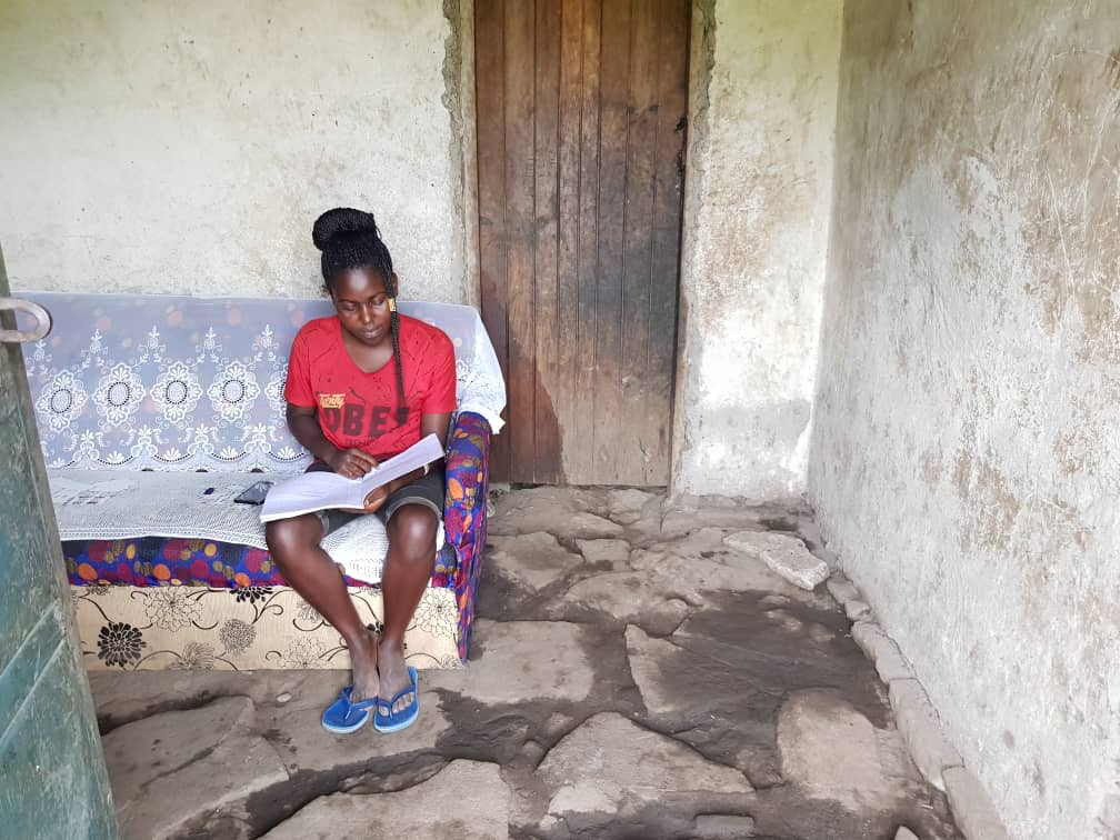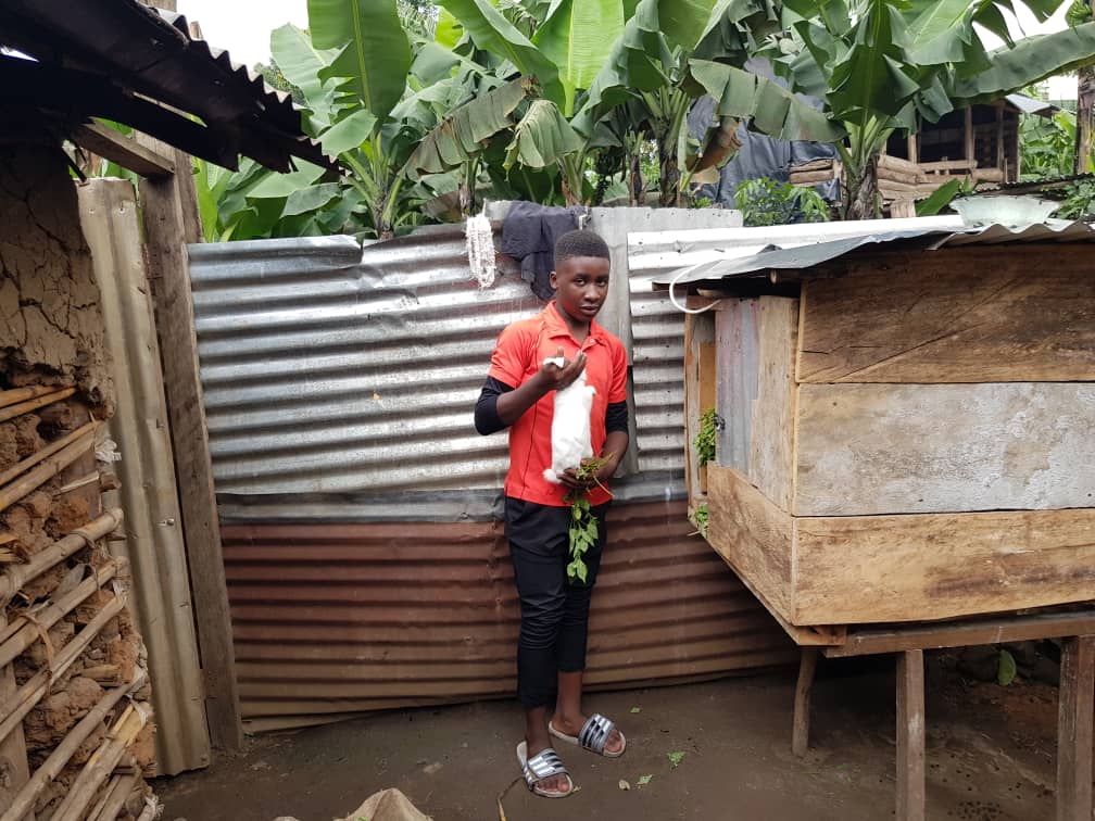 Our second visit was with Ellison. He is also in Senior 1 and stays with his mother. During the lockdown he too focused on domestic chores and gardening. Ellison is also entrepreneurial and so used his free time on a small business of raising rabbits which he sells in order to buy clothes, shoes and food. Right now he’s using some of the self-study materials he’s received to try to keep up. He wishes he could benefit from online learning like his schoolmates do, but he cannot afford a smartphone or reliably access the internet where he lives. He also misses meeting his friends and hasn’t had a chance to play since the beginning of the pandemic.
